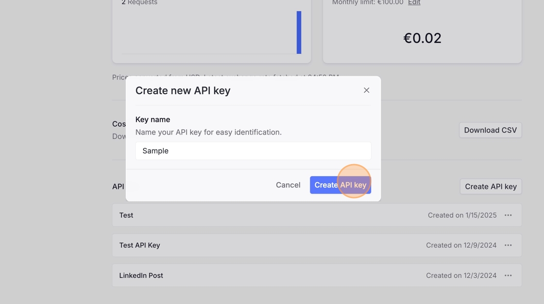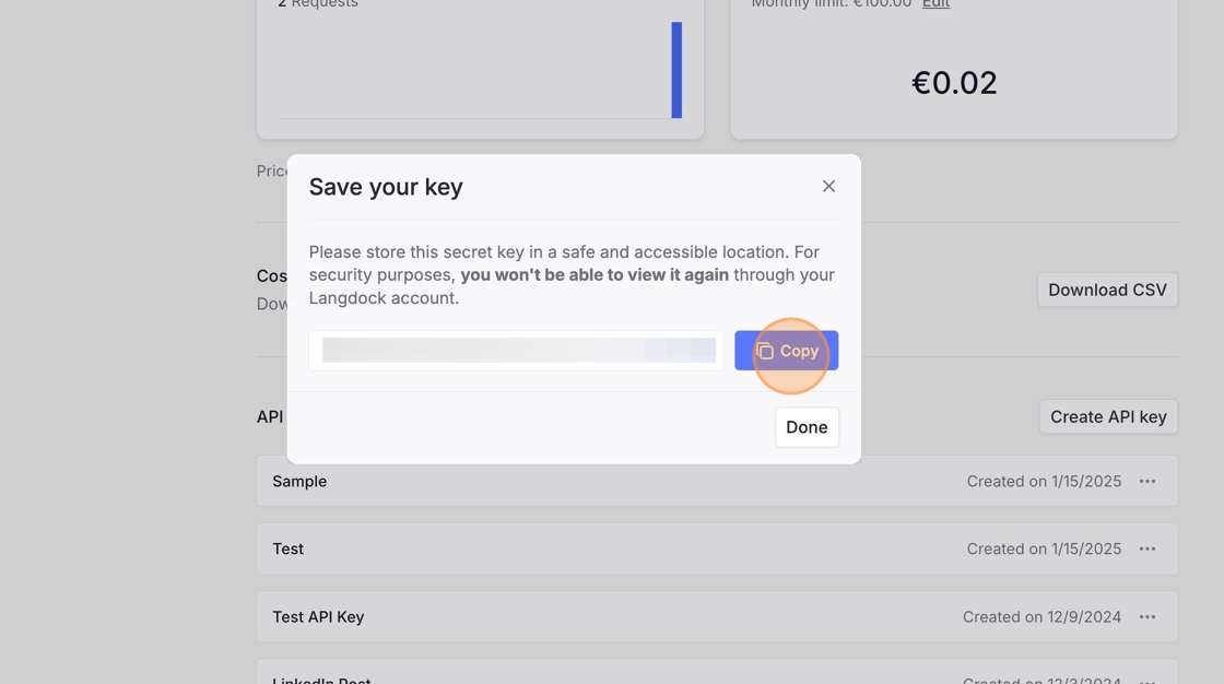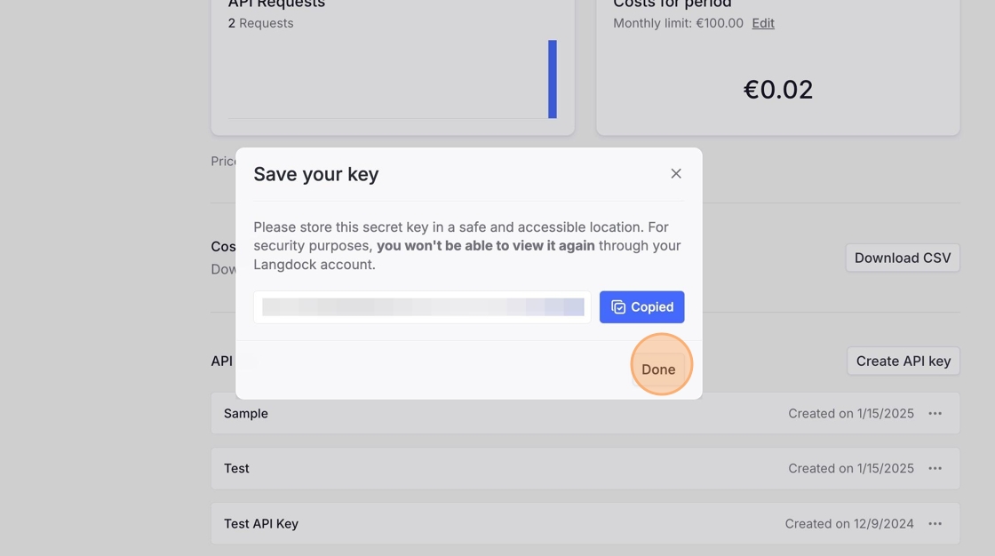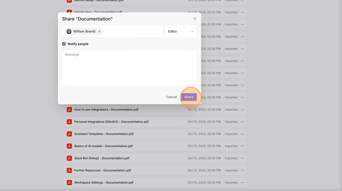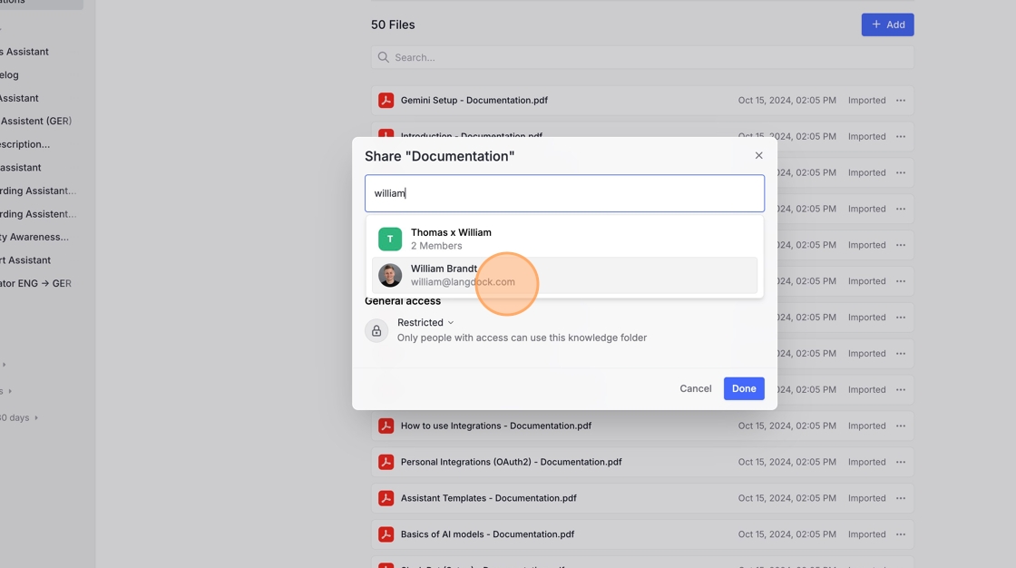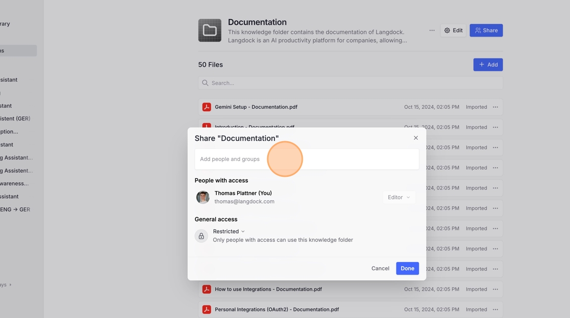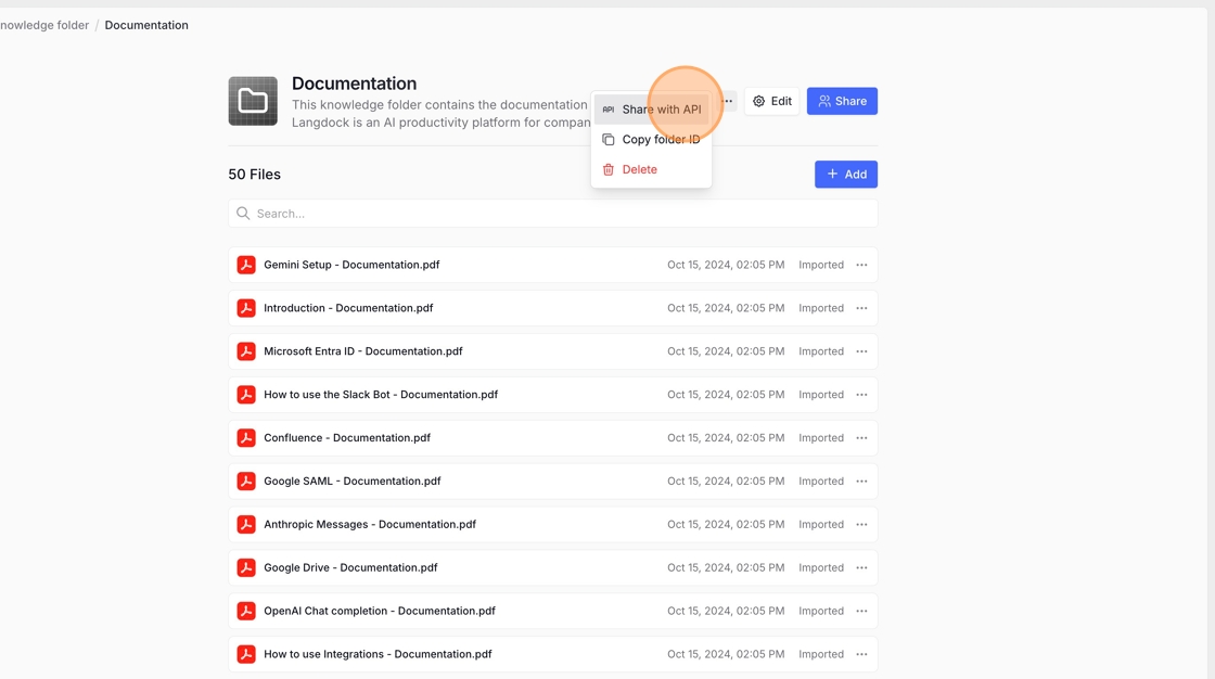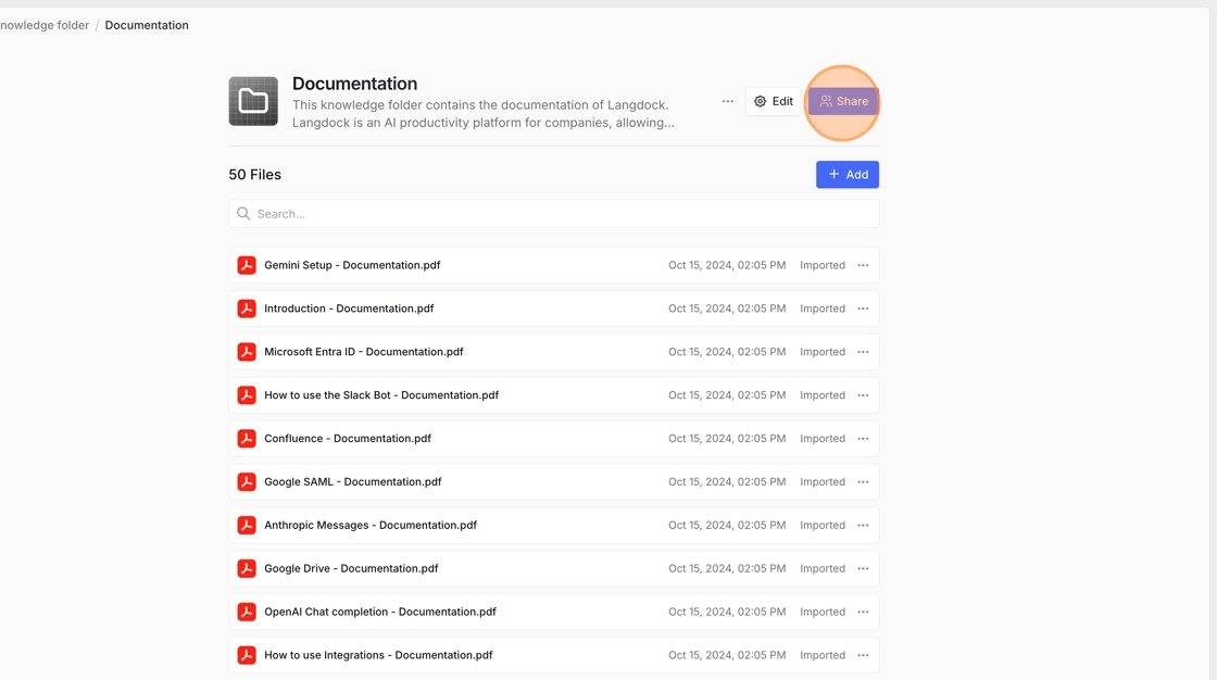 Een beheerder moet de API-sleutel aanmaken en de kennismap delen met die API-sleutel. Nodig een beheerder uit als editor voor je kennismap met de knop "Delen" in de rechterbovenhoek (sla deze stap over als je zelf een Langdock-beheerder bent).