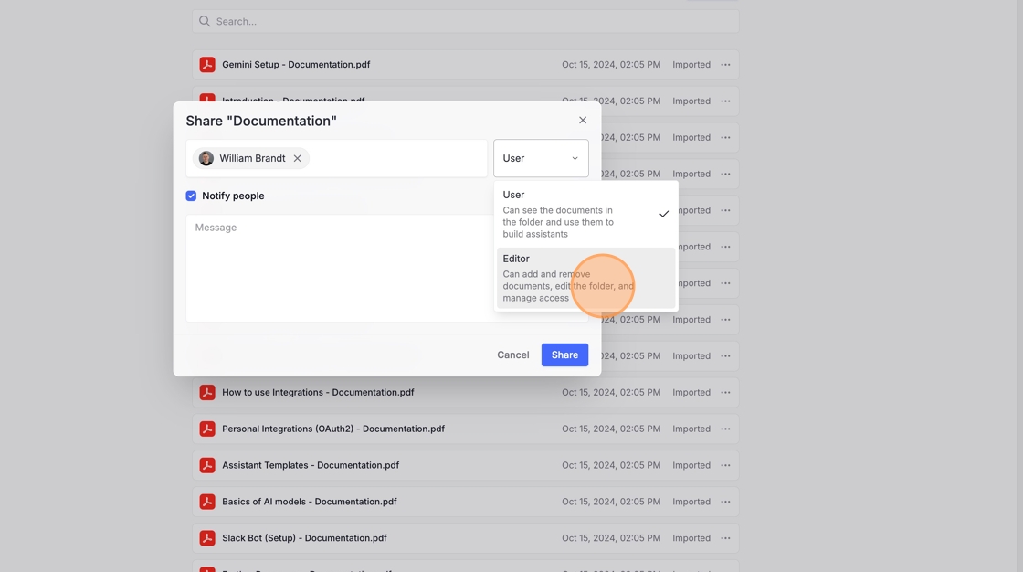 Klik in het veld "Personen en groepen toevoegen", typ de naam van een beheerder, selecteer die in de vervolgkeuzelijst en stel hun rol in op "Editor".