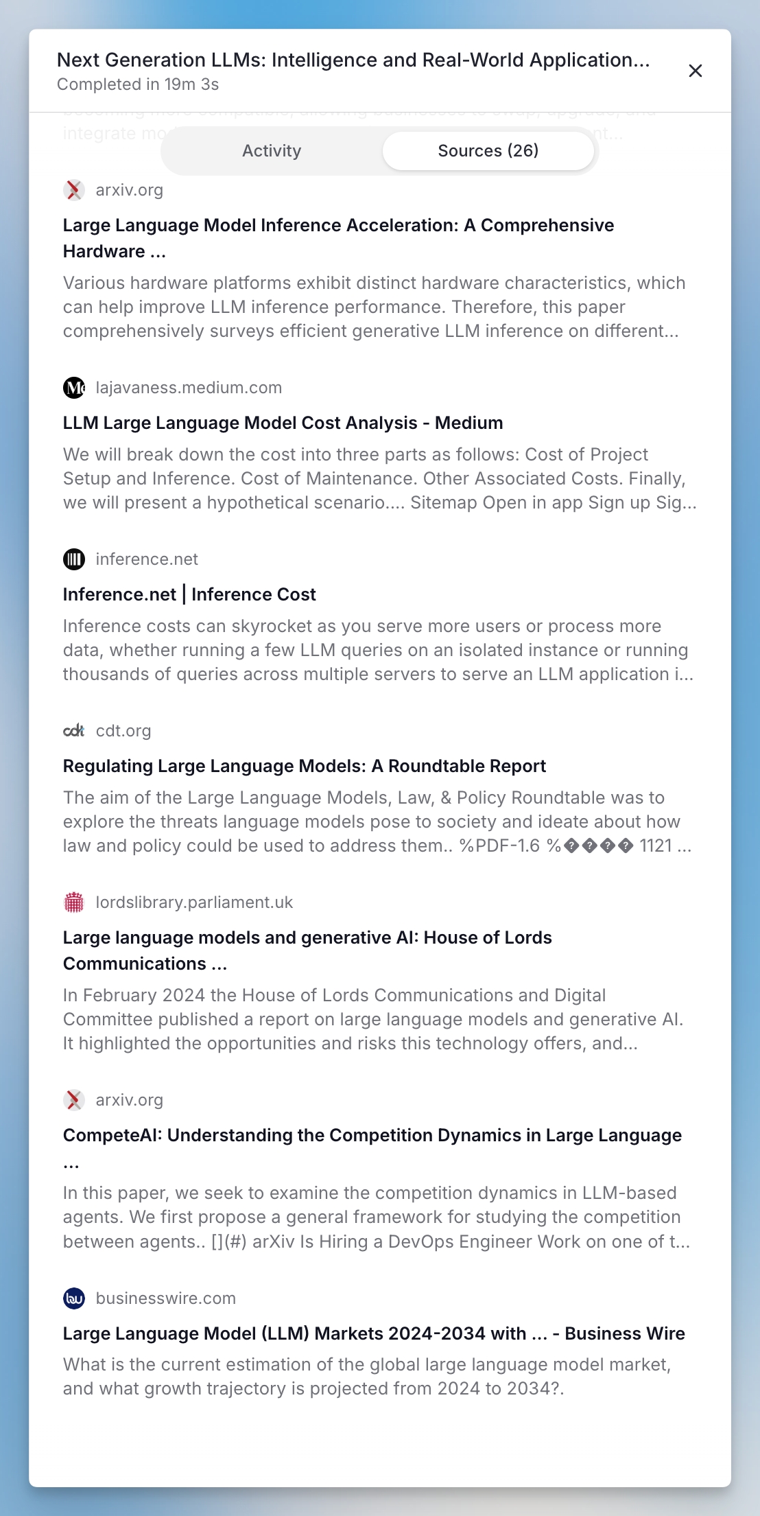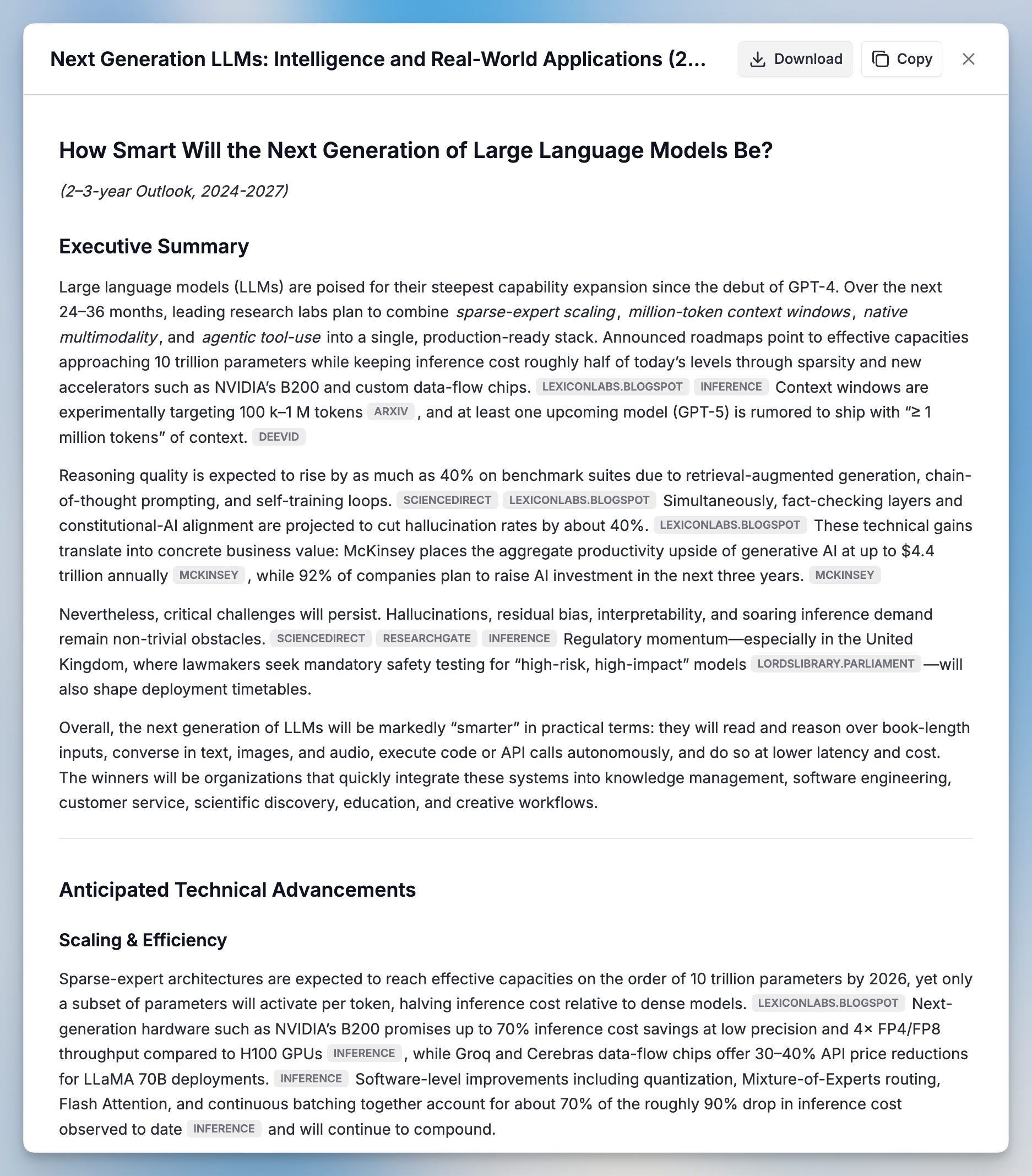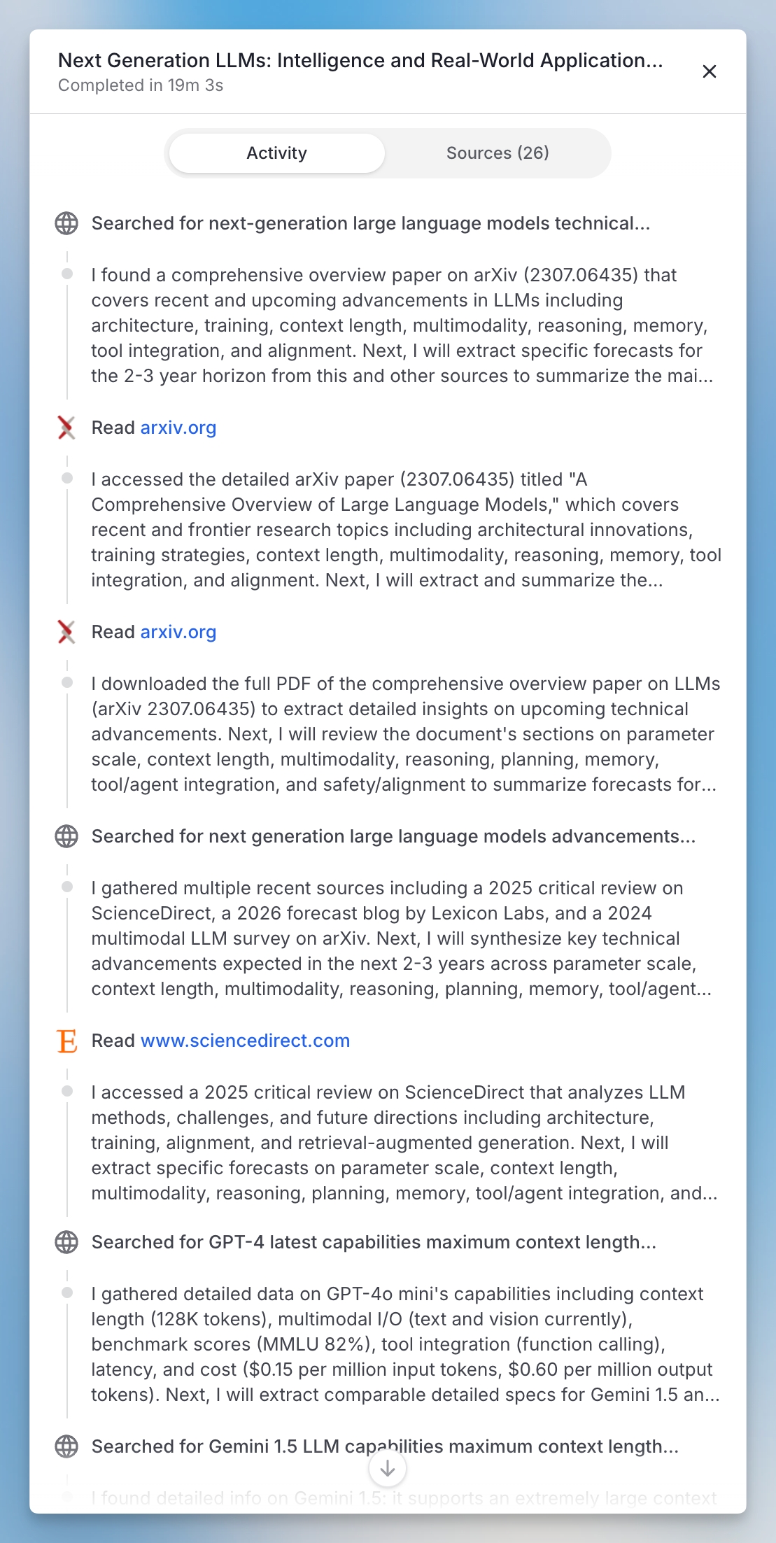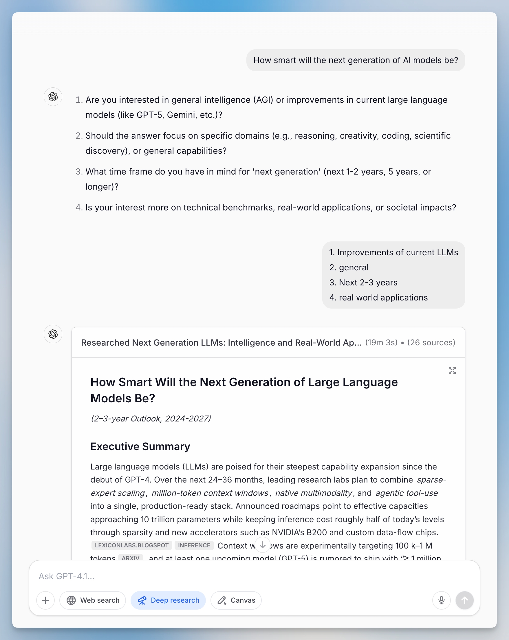 Deep Research pakt complexe onderzoeksprojecten aan door slim meerdere strategische webzoekopdrachten over verschillende invalshoeken te plannen en vervolgens de bevindingen te synthetiseren tot uitgebreide rapporten met correcte citaties. Het is ontworpen voor wanneer je grondig onderzoek nodig hebt in plaats van snelle antwoorden.