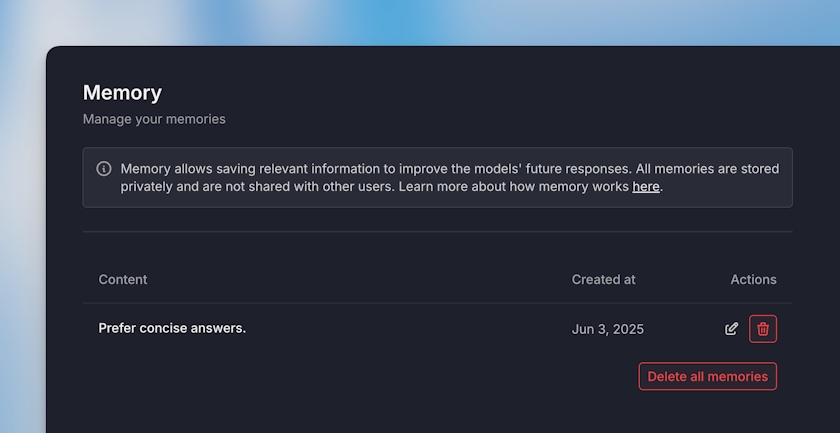 Je kunt al je herinneringen bekijken en beheren door naar het tabblad “Geheugen” in je accountinstellingen te gaan. Daar vind je ook een bewerkoptie als je de formulering wilt aanpassen zonder het proces voor het aanmaken van herinneringen opnieuw te doorlopen.
